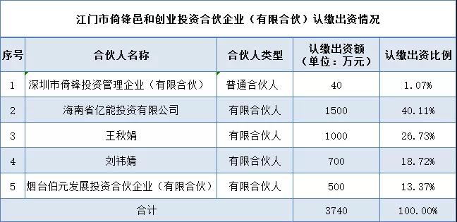 据了解,2021年12月,东方精工曾发布公告,海南省亿能投资有限公司(下称:海南亿能)与专业投资机构深圳市倚锋投资管理企业(有限合伙)等其他合伙人,共同投资江门市倚锋邑和创业投资合伙企业(有限合伙)(下称:倚锋邑和基金)。