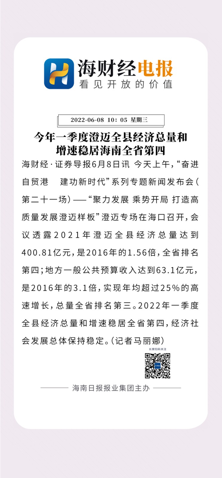 海财经·证券导报6月9日讯(记者 马丽娜) 8日上午,“奋进自贸港 建功新时代”系列专题新闻发布会(第二十一场)——“聚力发展 乘势开局 打造高质量发展澄迈样板”澄迈专场在海口召开,会议透露2021年澄迈全县经济总量达到400.81亿元,是2016年的1.56倍,全省排名第四;地方一般公共预算收入达到63.1亿元,是2016年的3.1倍,实现年均超过25%的高速增长,总量全省排名第三。2022年一季度全县经济总量和增速稳居全省第四,经济社会发展总体保持稳定。