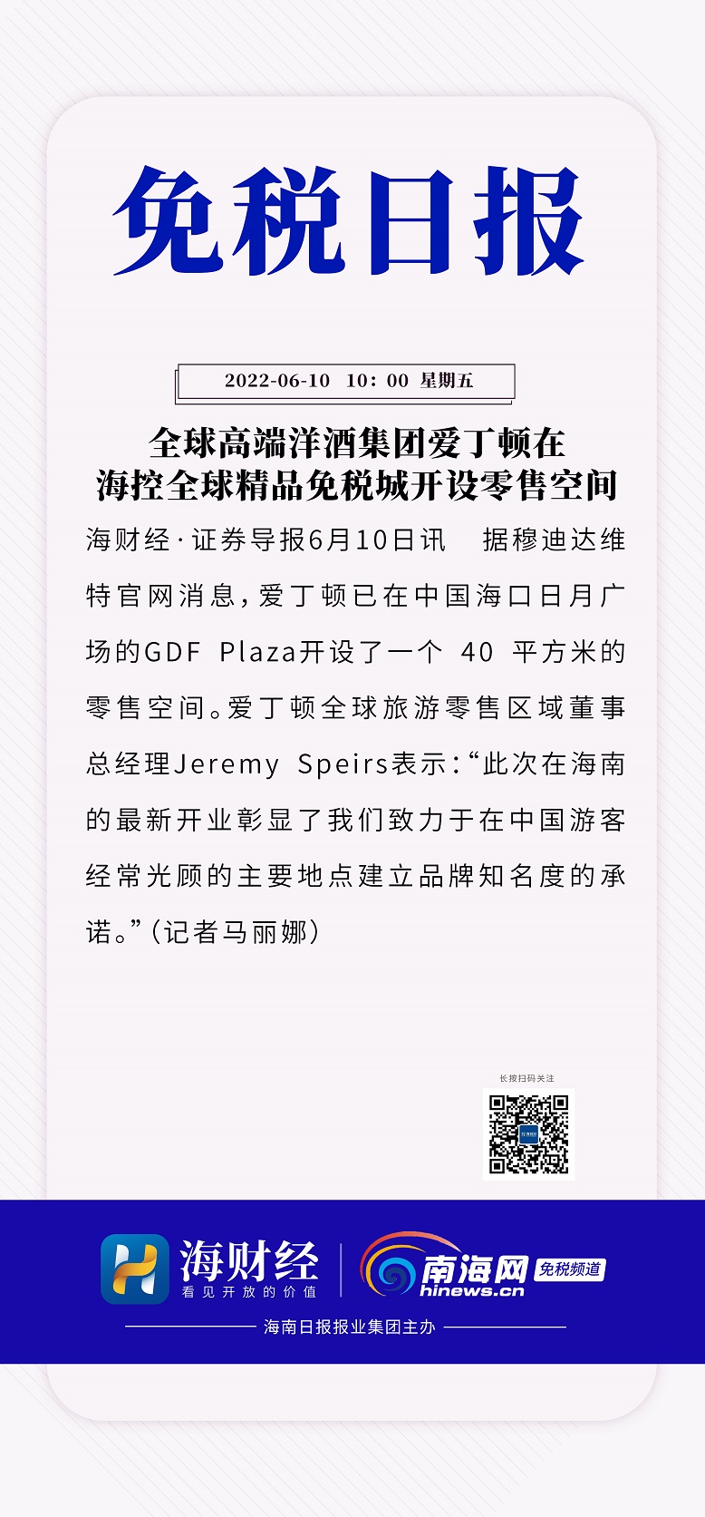 海财经·证券导报6月10日讯(记者马丽娜)据穆迪达维特官网消息,爱丁顿已在中国海口日月广场的GDF Plaza开设了一个40平方米的零售空间。爱丁顿全球旅游零售区域董事总经理Jeremy Speirs表示:“此次在海南的最新开业彰显了我们致力于在中国游客经常光顾的主要地点建立品牌知名度的承诺。”