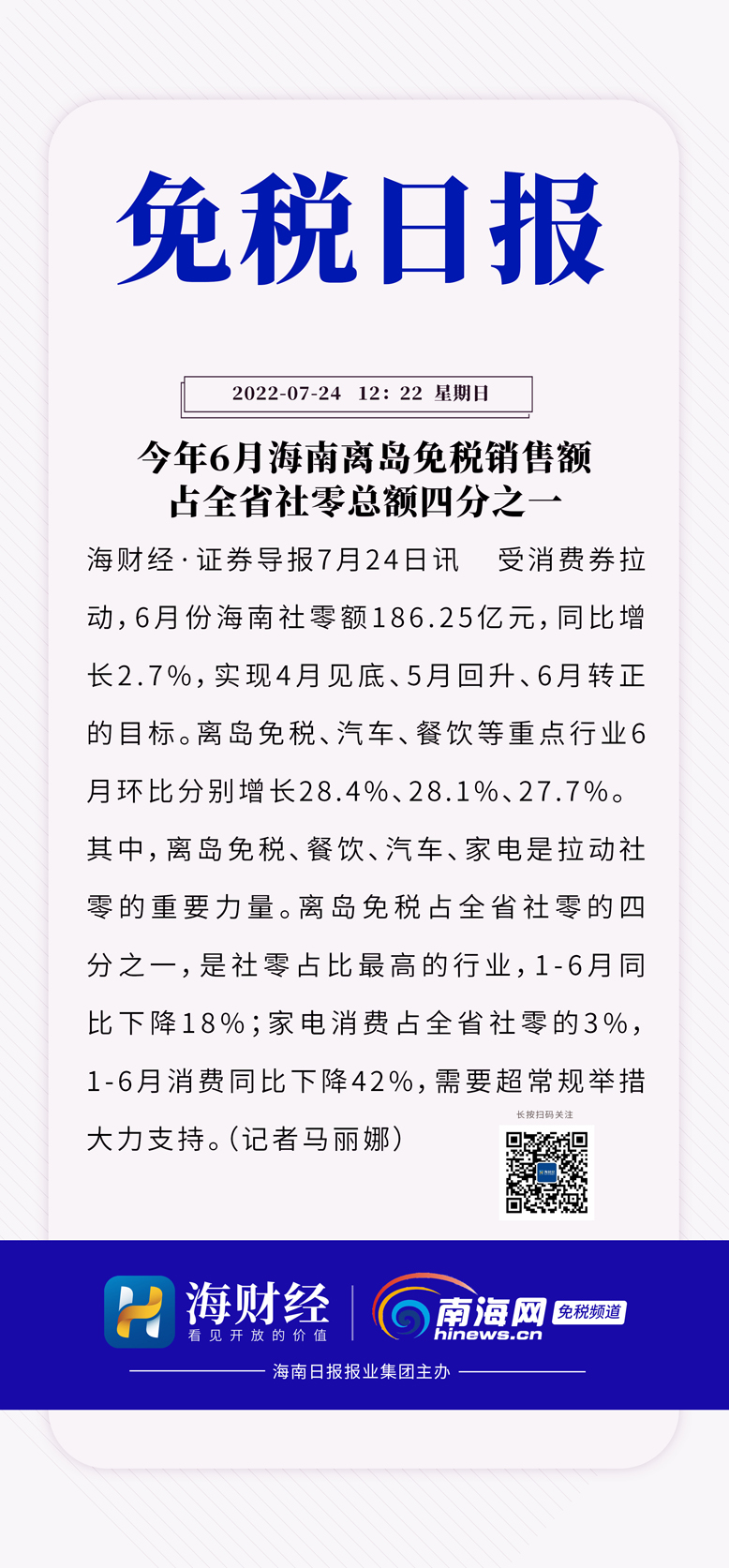 海财经·证券导报7月24日讯(记者 马丽娜) 7月24日,记者从海南省商务厅获悉,受消费券拉动,6月份海南社会消费品零售总额186.25亿元,同比增长2.7%,实现4月见底、5月回升、6月转正的目标。离岛免税、汽车、餐饮等重点行业6月环比分别增长28.4%、28.1%、27.7%。