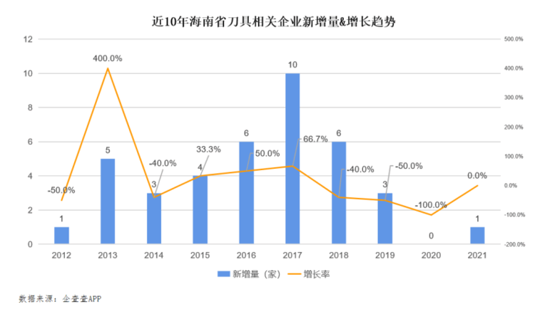记者通过企查查发现,海南现存刀具相关企业58家,近十年新增刀具相关企业39家。其中,2013年新增5家,同比增幅400%,增长速度最快;2017年新增刀具相关企业10家,新增数量最多。