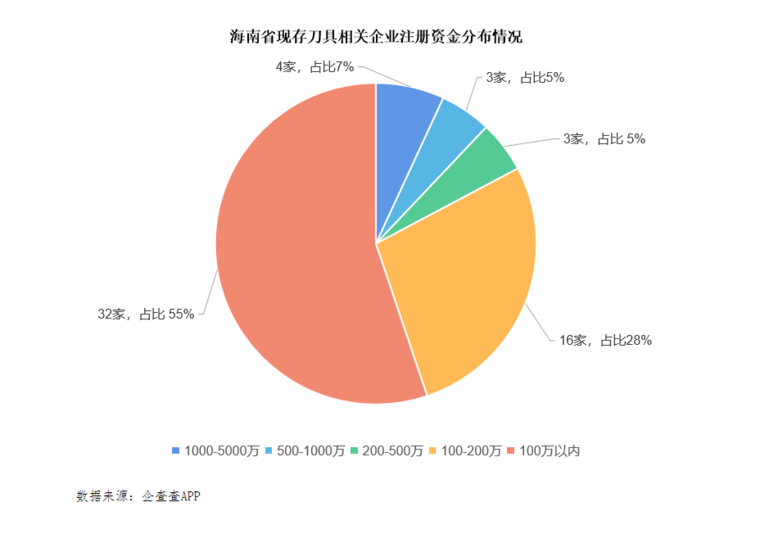 从注册资金分布情况来看,海南现存刀具相关企业注册资金在100万元以内的最多,有32家,占比55%;其次是注册资金在100万元-200万元之间的企业,有16家,占比28%。
