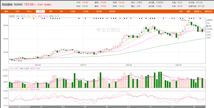 9月20日10点40分,钧达股份涨停,报193.66元,成交7.5亿元,换手率2.88%。该股近一年涨停25次。