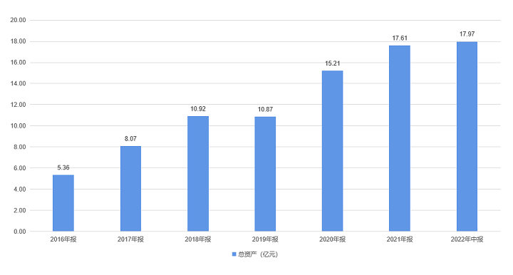自2016年完成股改以来,葫芦娃药业公司资产规模持续扩大。截至2022年上半年,公司总资产达到17.97亿元,为2016年的3.4倍;净资产为9.88亿元,六年增长6.66倍。