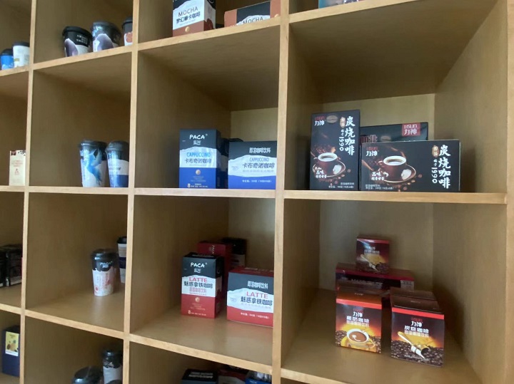 力神咖啡总部办公间成列着的各类力神咖啡产品。记者 马丽娜/摄