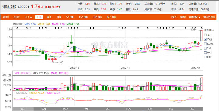 12月5日10:42,海航控股(600221)盘中涨停,报1.79元,成交7.37亿元,换手率1.28%。