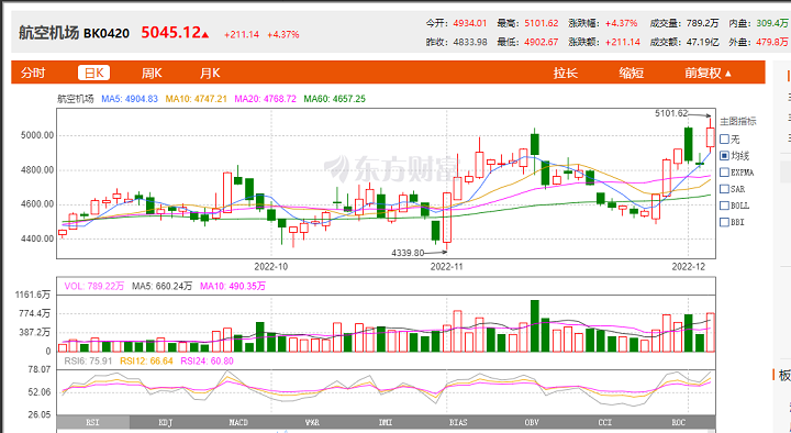 5日,航空机场板块走强。截至10:48,航空板块大涨4.37%报5045.12。海航控股领涨、厦门空港(600897)逼近涨停,海南机场(600515)、中国东航(600115)、深圳机场(000089)、白云机场(600004)等个股涨超4%。(海财经编辑)