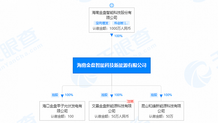 日前,海口金盘甲子光伏发电有限公司成立,股权穿透信息显示,该公司由海南金盘智能科技股份有限公司(688676)(下称“金盘科技”)间接全资控股。