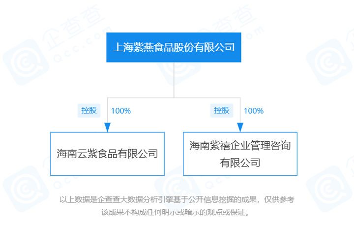 海财经·证券导报2月2日讯(记者 梁天琪 实习生 李梦宇)2月1日,海南紫禧企业管理咨询有限公司成立,股权穿透信息显示,该公司由紫燕食品(603057)100%控股。