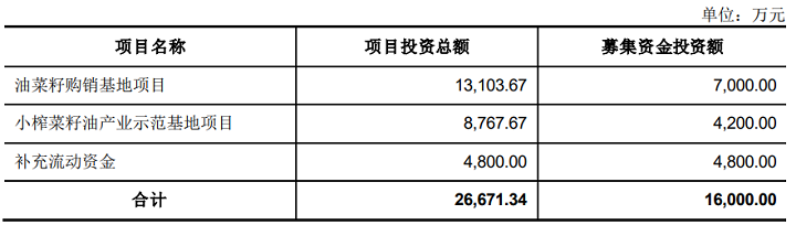 根据股票发行预案,扣除发行费用后的募集资金净额将全部用于油菜籽购销基地项目、小榨菜籽油产业示范基地项目及补充流动资金。