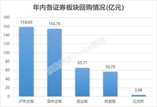 从证券板块来看,沪市主板回购最多,为158.4亿元。深市主板紧随其后,回购金额154.76亿元。创业板和科创板分别回购了65.71亿元和56.76亿元。北交所则回购了3.98亿元。