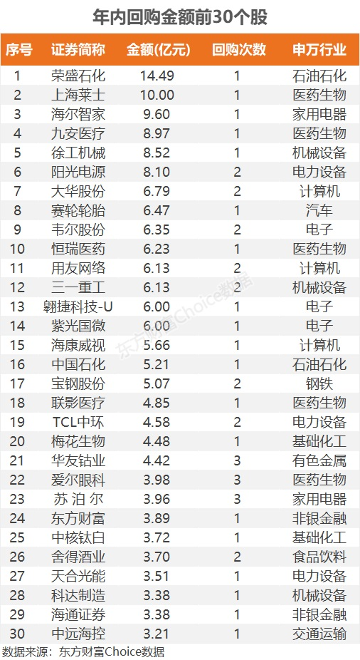 具体看个股,荣盛石化为年内回购金额最多个股,达14.49亿元。上海莱士紧随其后,年内回购10亿元。海尔智家回购9.6亿元。九安医疗回购8.97亿元。徐工机械回购8.52亿元。