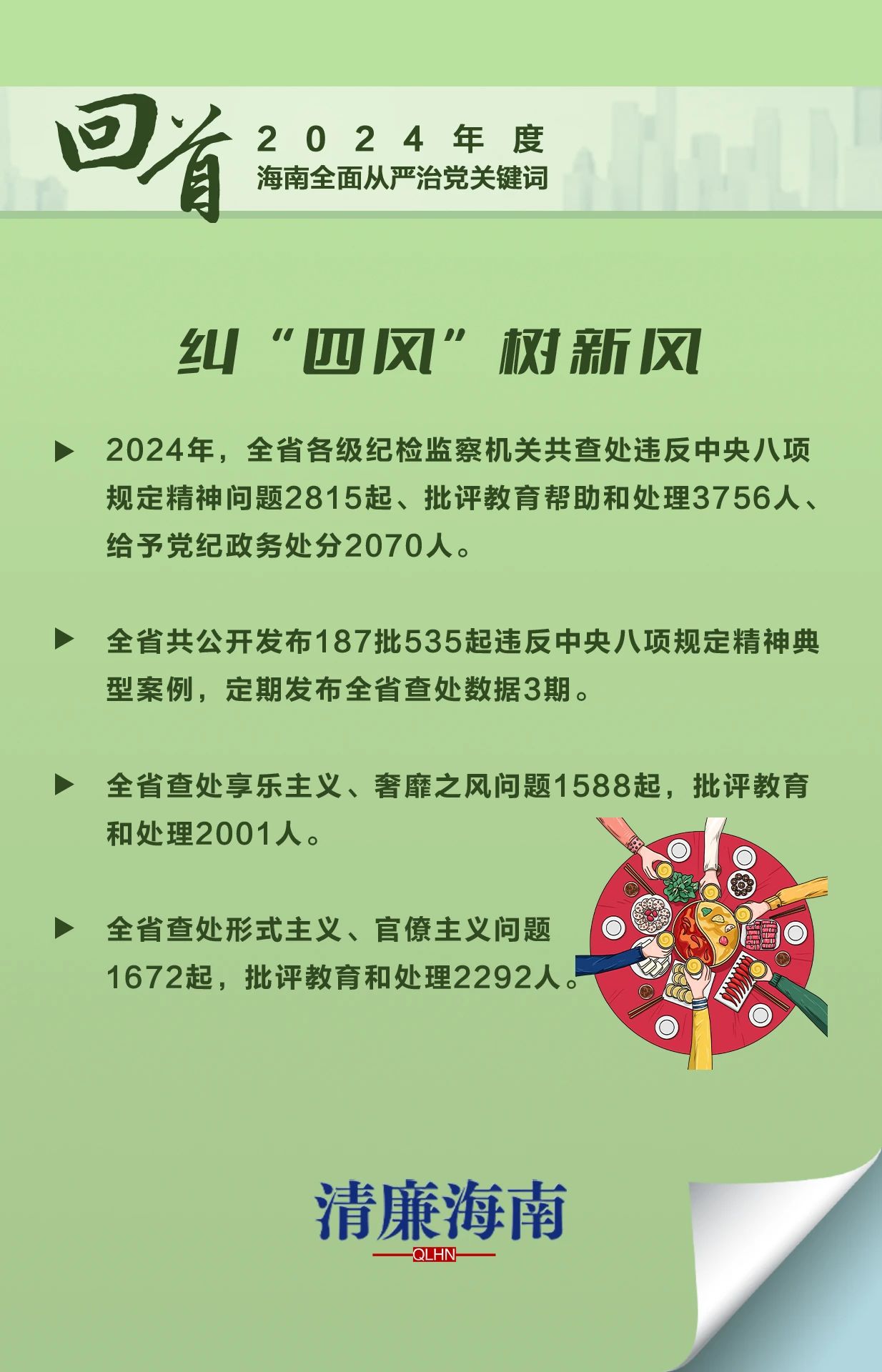 纠治“四风”永不停歇,作风建设永不止步。过去一年,全省各级纪检监察机关持之以恒筑牢中央八项规定堤坝,一以贯之保持纠治“四风”高压态势,锲而不舍、久久为功,始终保持永远在路上的政治自觉,持续强化监督执纪问责,推动作风建设不断深入。2024年,全省各级纪检监察机关共查处违反中央八项规定精神问题2815起、批评教育帮助和处理3756人、给予党纪政务处分2070人,把严的基调一贯到底。