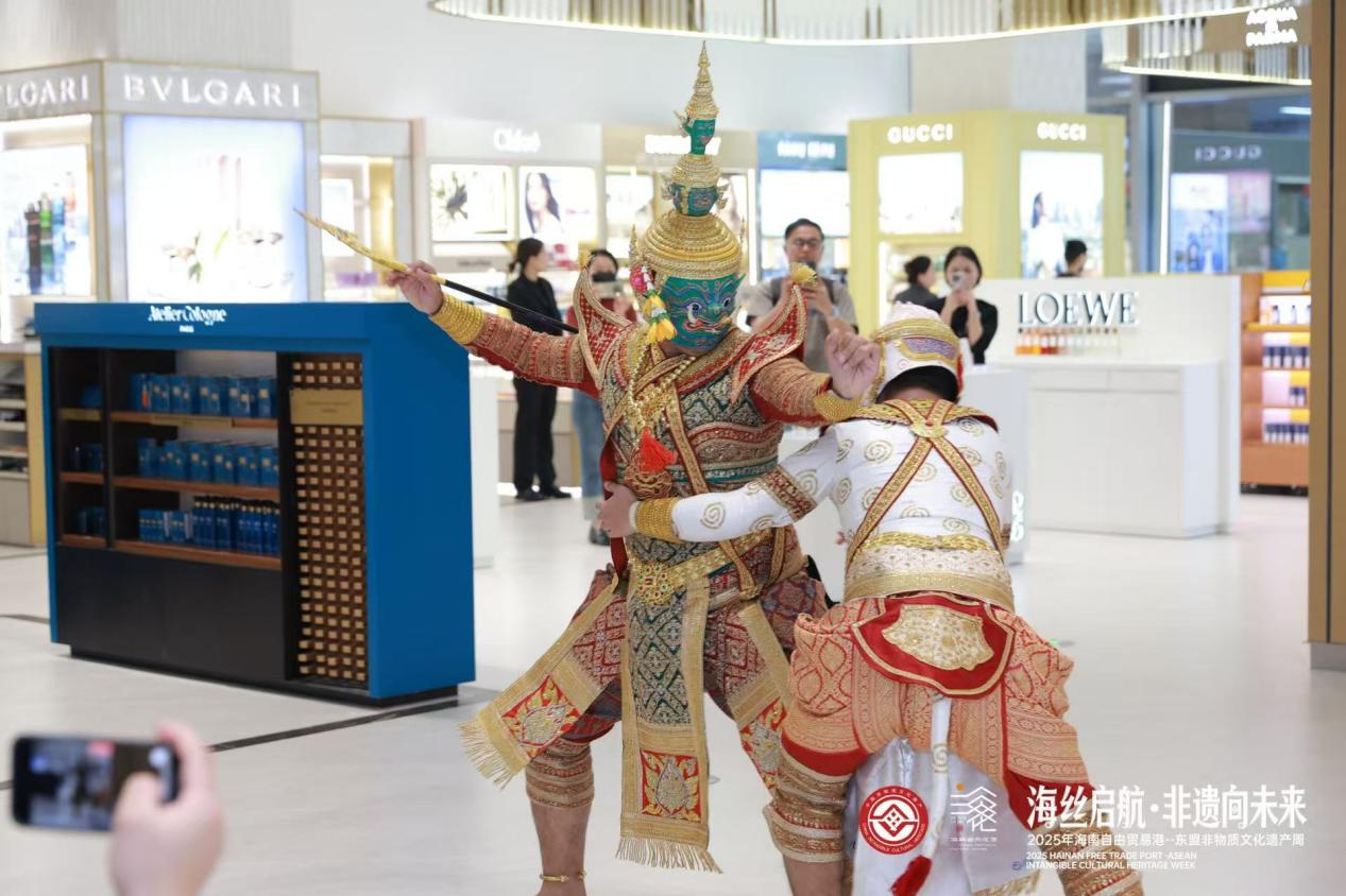 泰国孔剧、人偶戏与马来西亚咚当撒央组成“非遗天团”走进日月广场免税店及友谊阳光城。演员们在商场通道缓缓前行,精致的造型与生动的表演成为移动的“文化风景”。在表演间隙,不少家长带着孩子与演员们亲密合影。