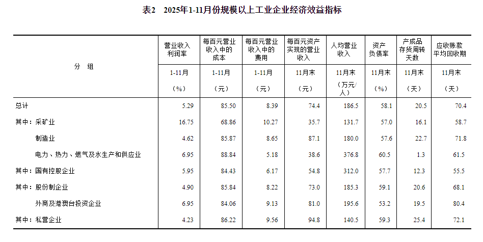 11月末,规模以上工业企业每百元资产实现的营业收入为74.4元,同比减少2.4元;人均营业收入为186.5万元,同比增加5.7万元;产成品存货周转天数为20.5天,同比增加0.6天;应收账款平均回收期为70.4天,同比增加3.7天。