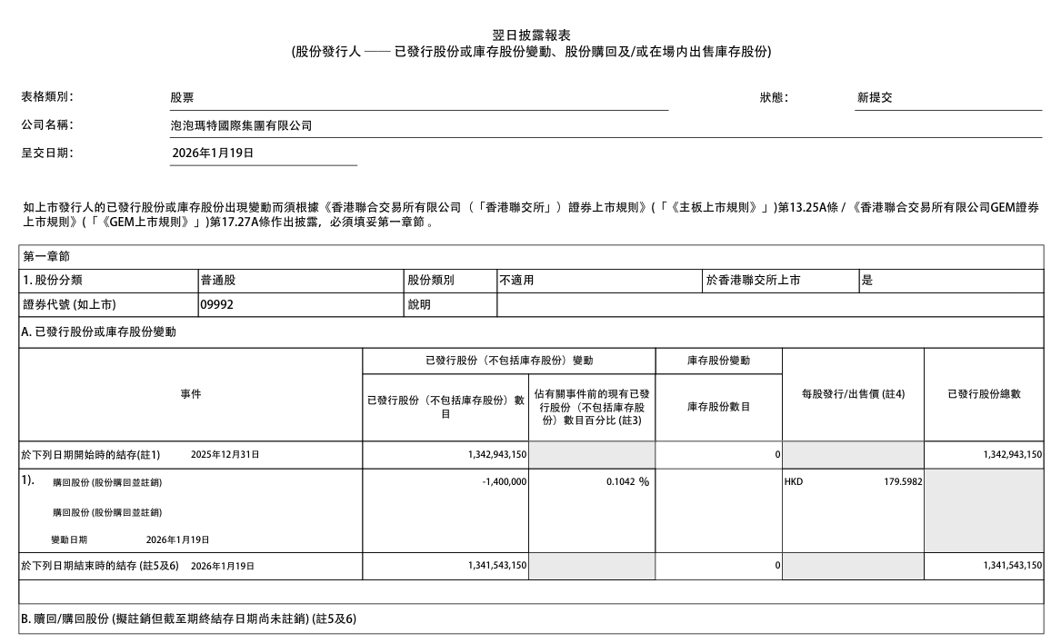 海财经·证券导报1月19日讯(记者 符容菁)泡泡玛特国际集团有限公司(以下简称“泡泡玛特”,港股股票代码:09992)发布公告称,公司于2026年1月19日斥资2.51亿港元回购140万股股份,每股回购价177.7港元至181.2港元。回购完成后,泡泡玛特的已发行股份总数从1342943150股减少至1341543150股。