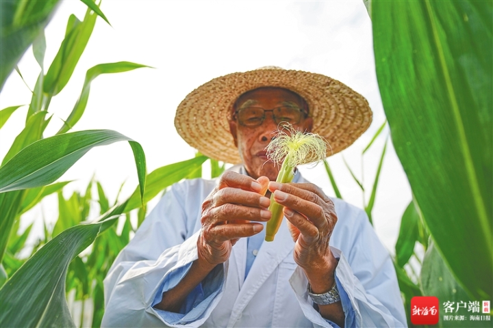 河南省鹤壁市农业科学院玉米育种专家程相文,在海南三亚一处南繁基地内查看授粉期玉米材料的生长情况。海南日报记者 王程龙 摄