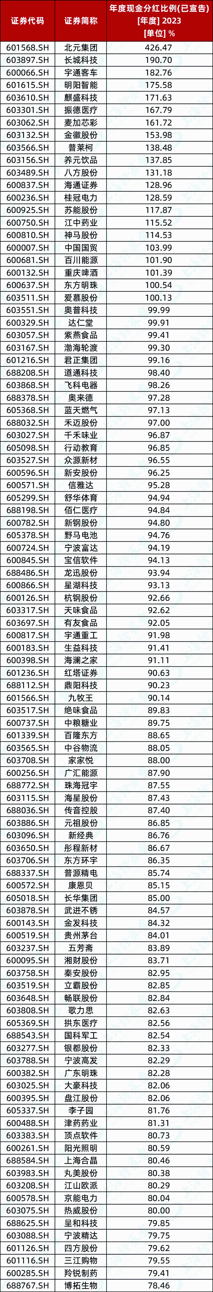 归母净利润大于1亿元 分红比例前100公司名单