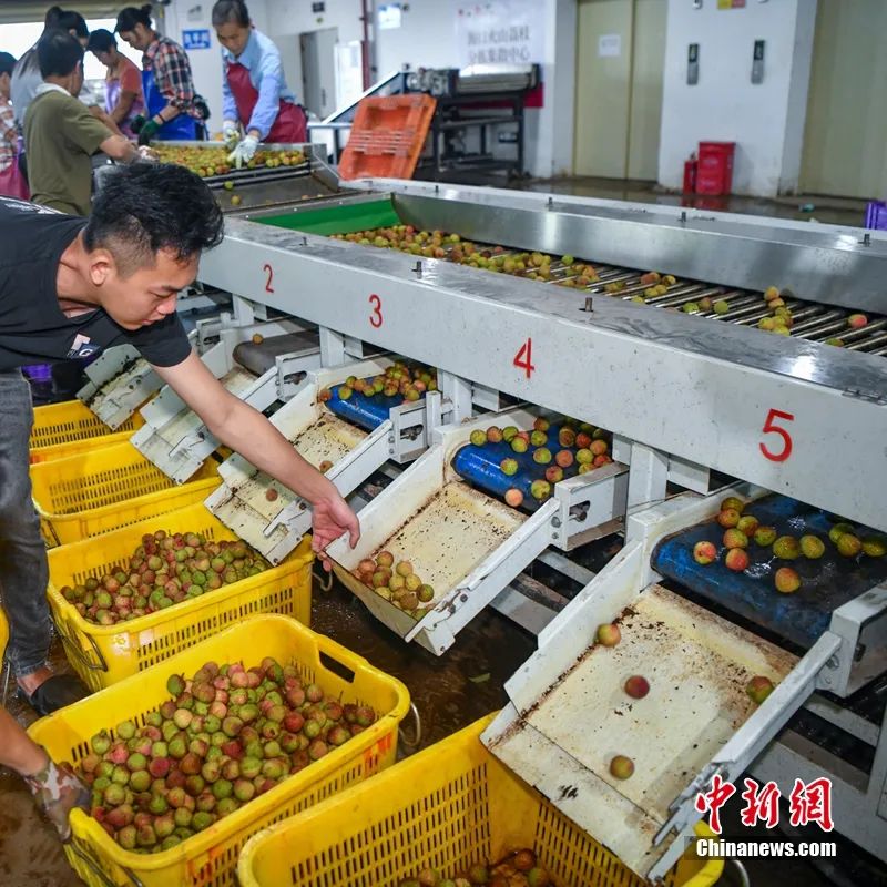 图为海南红明农产品(荔枝)交易中心的工作人员利用机器筛选荔枝大小。骆云飞 摄