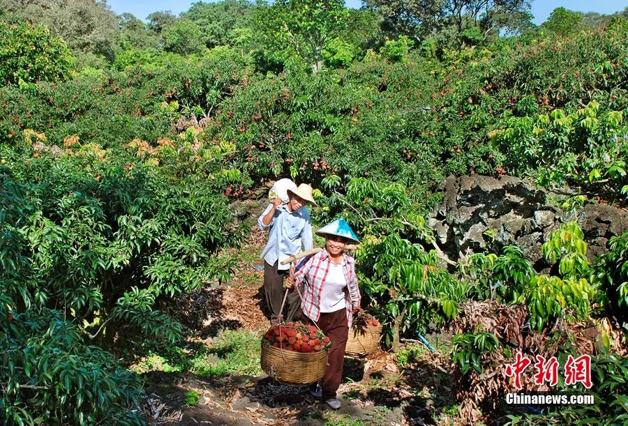 图为海口火山荔枝丰收季,果农肩挑沉甸甸的竹筐,汗水与笑容交织。秀英区委宣传部供图