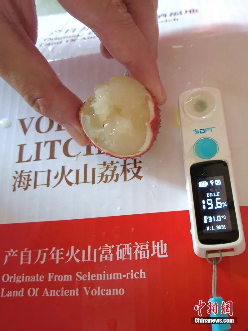 图为工作人员对荔枝甜度进行检测。黄文燕 摄