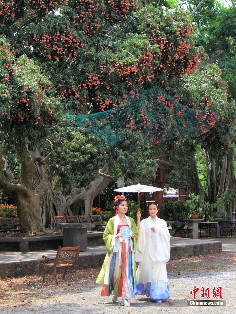 图为身着汉服的游客在荔枝树下拍照。秀英区委宣传部供图