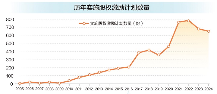 近年来,A股股权激励计划数量呈现出逐步增长势头。截至2025年5月底,近20年来A股市场累计已有超5600份股权激励计划落地,涉及上市公司超2900家,其中近4年均有超650份计划实施。