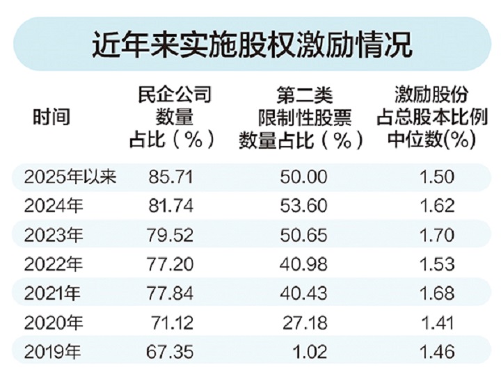 第二,民营上市公司股权激励积极性显著提升。数据显示,在实施股权激励的公司中,民营企业连续5年占比超过七成,而2024年更是突破81%,创下19年来新高,今年以来占比更是超过85%。