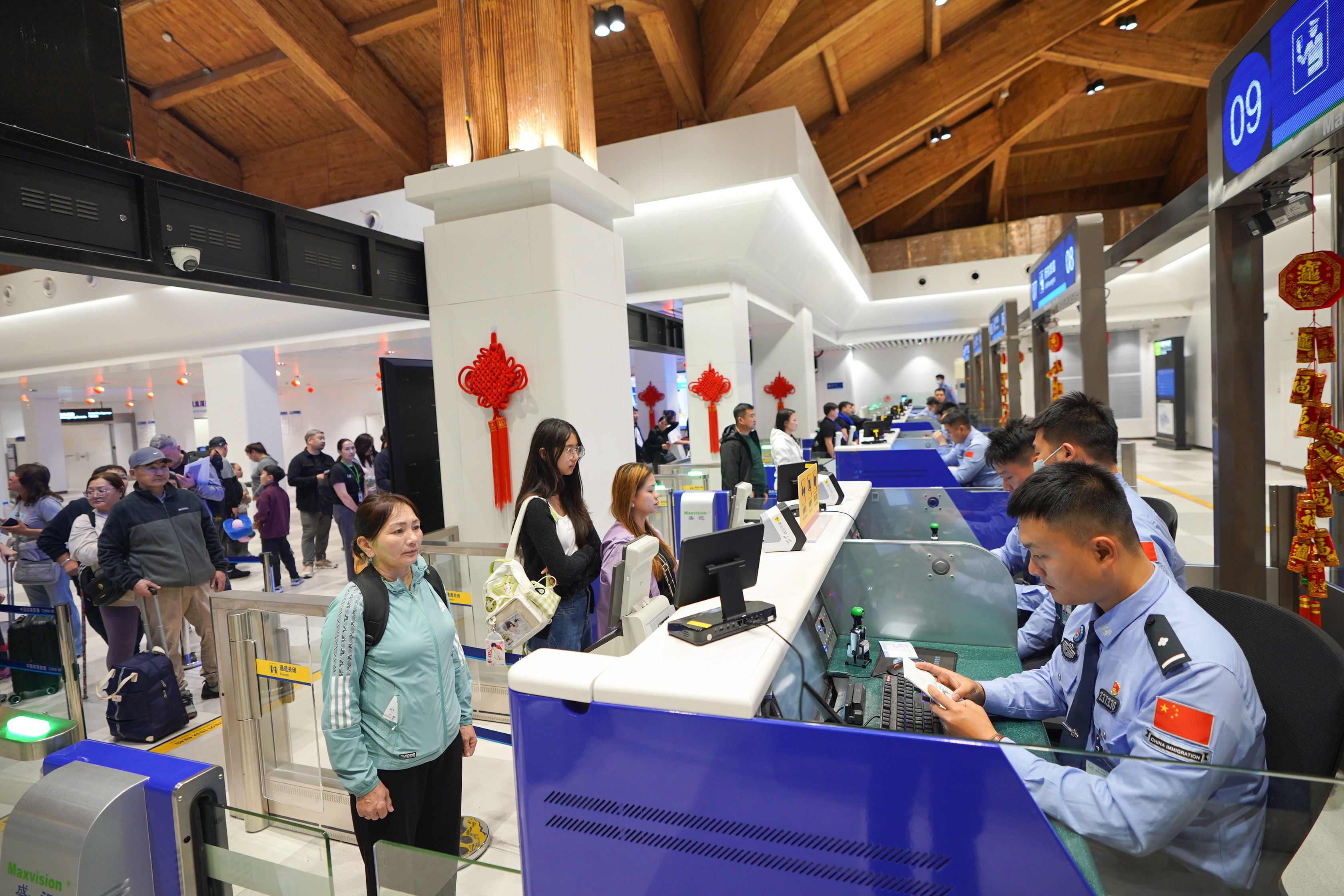 为应对春节假期出入境客流高峰,美兰、凤凰出入境边防检查站提前发布客流高峰预测,实时监测旅客流量变化,加强现场勤务组织,合理安排执勤警力,提前开足查验通道,增设现场标识指引,推出24小时直接过境免办边防检查手续、外国人入境卡网上填报、团体旅游签证网上申办等系列便利措施,确保中外旅客高效、顺畅通关。