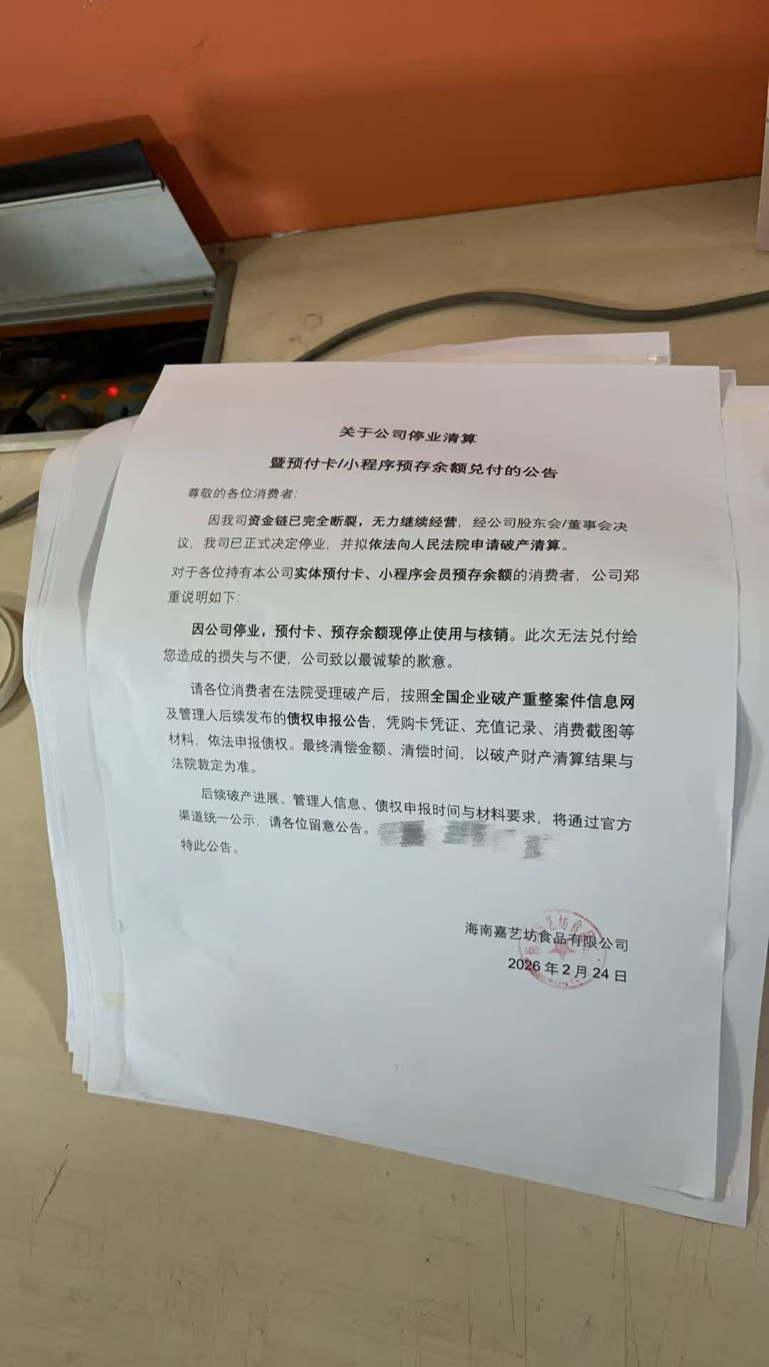 不过,嘉艺坊在一份《致门店部员工的停业告知通知》中表示,原公司个体门店归由海南嘉艺坊食品有限公司承债式收购,相关事宜均由嘉艺坊食品有限公司承接所有债权债务。若消费者手中持有门店备用金、顾客预付款相关凭证,请务必在交接时一并上交,公司将统一登记处理,确保顾客与员工的双重权益。